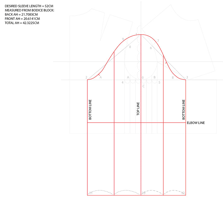 The sleeve block is a very basic one, as there is not shaping along the length of the arm. The block can be used as-is; it is also a good starting point for further style development. In the Bunka Fashion Series textbook, it is noted that a deficiency in back sleeve may occur in larger bust sizes. In this case, the Bunka method has catered for this by increasing the back sleeve width by a predetermined amount. This amount increases with bust measurement and is given in a table within the textbook.